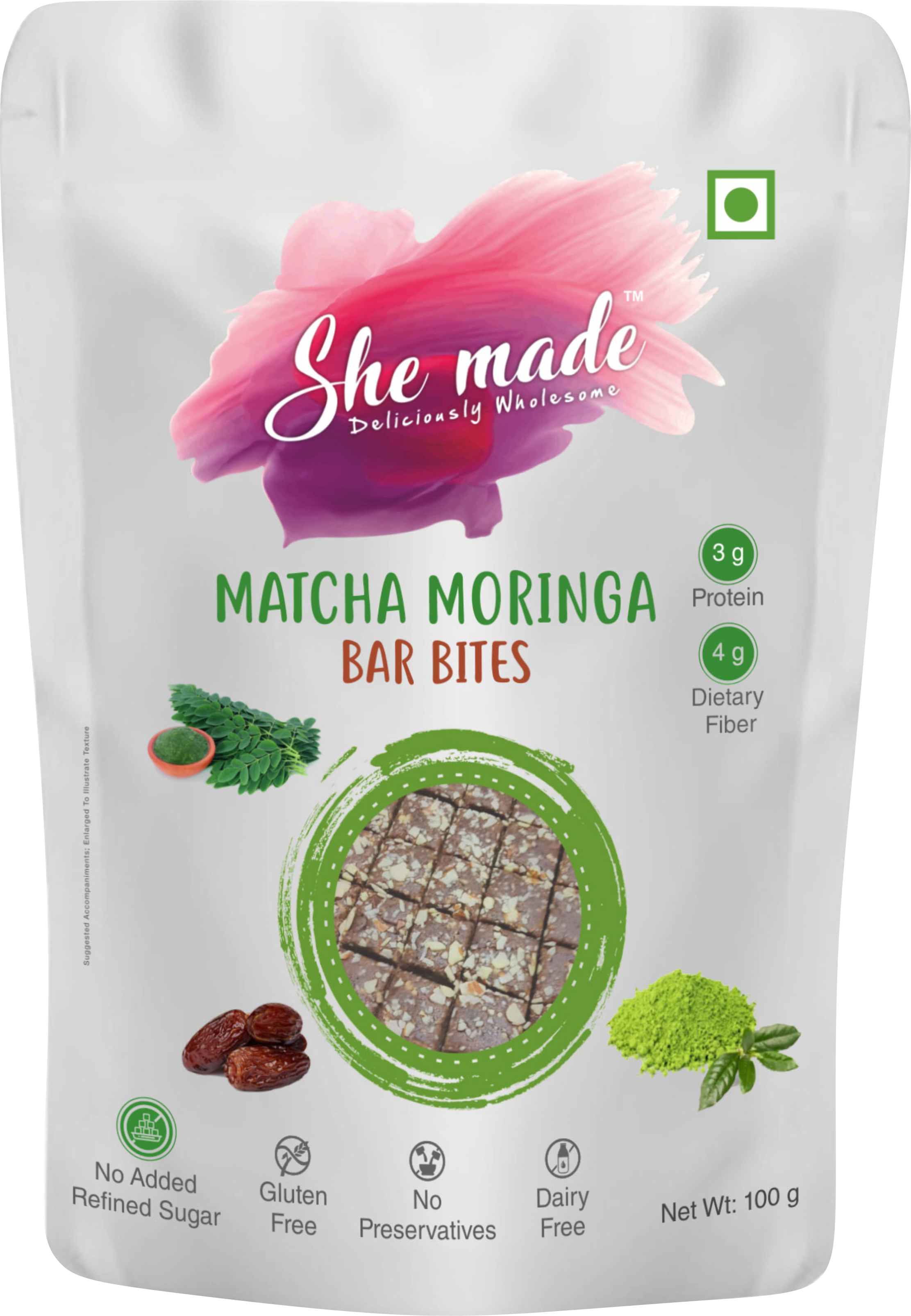 Made with ingredients such as dates, almonds, oats, pumpkin seeds, moringa powder, chia seeds, matcha powder, and cardamom , our bar bites are perfect for growing kids and adults. The delicious bittersweet taste of matcha and moringa makes it a perfect treat for everyone.