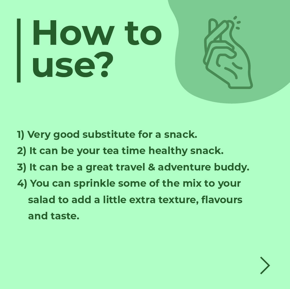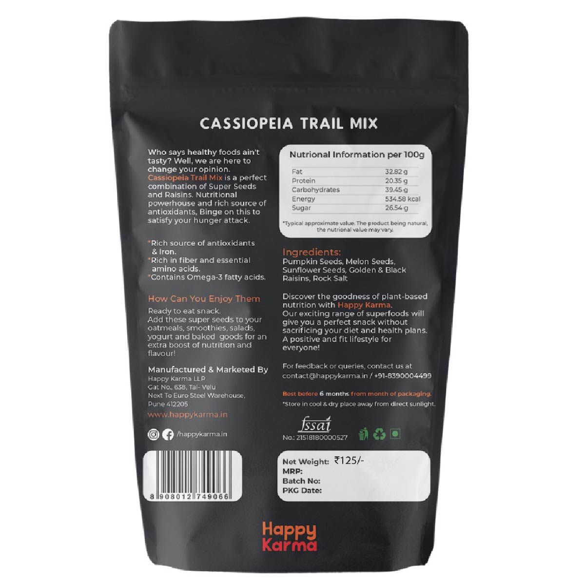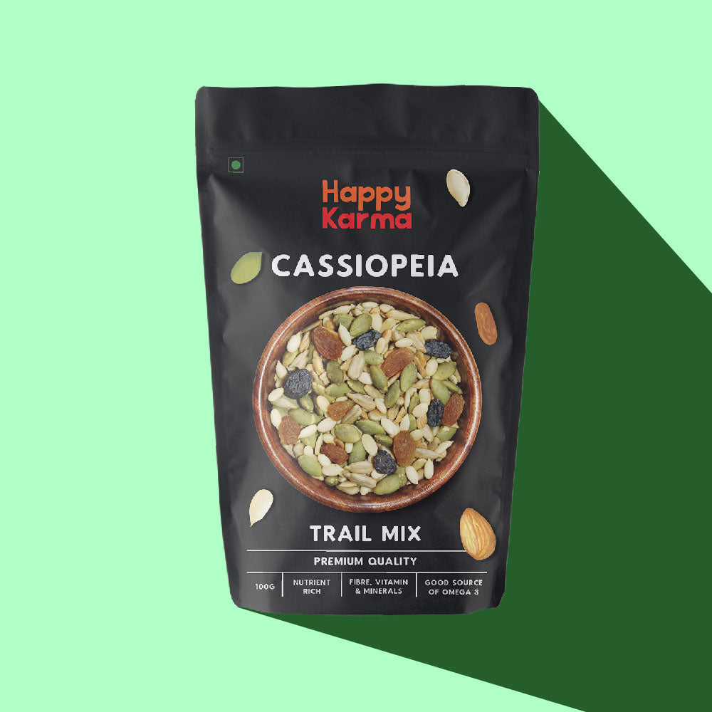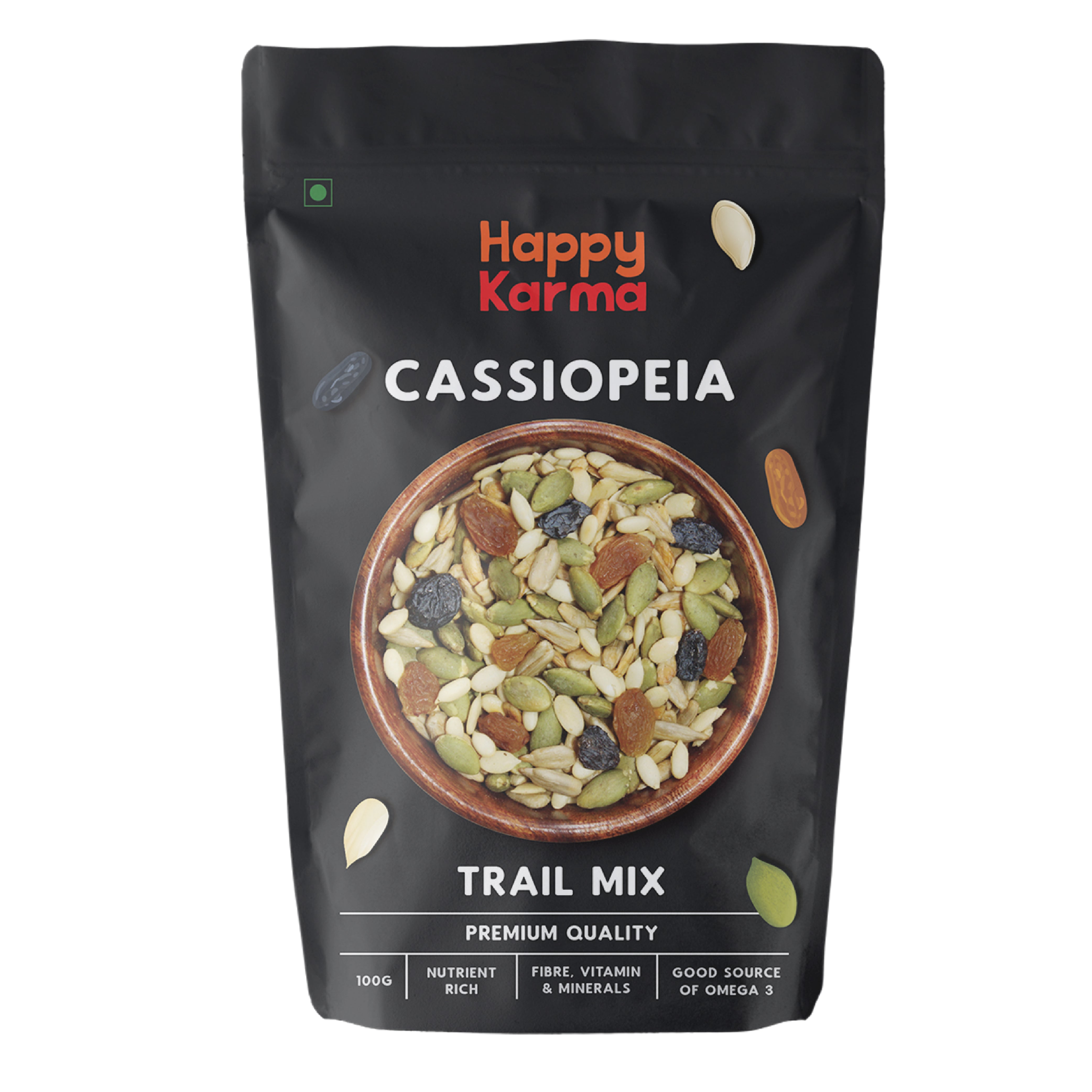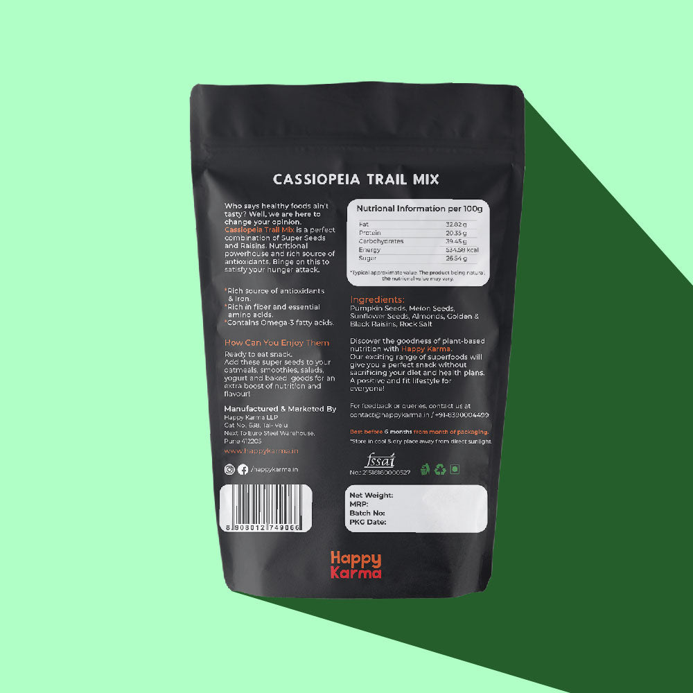 Happy Karma Cassiopeia Trail Mix is an excellent combination of Pumpkin seeds, Melon seeds, Sunflower seeds with Black and Golden Rasins. It is a great snacks and also a healthy alternative. If you add the trail mix to your oatmeals, smoothies, salads it gives your body an extra boost of nutrition and nutty flavour that you will be crazy about.