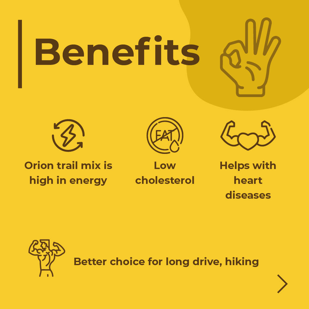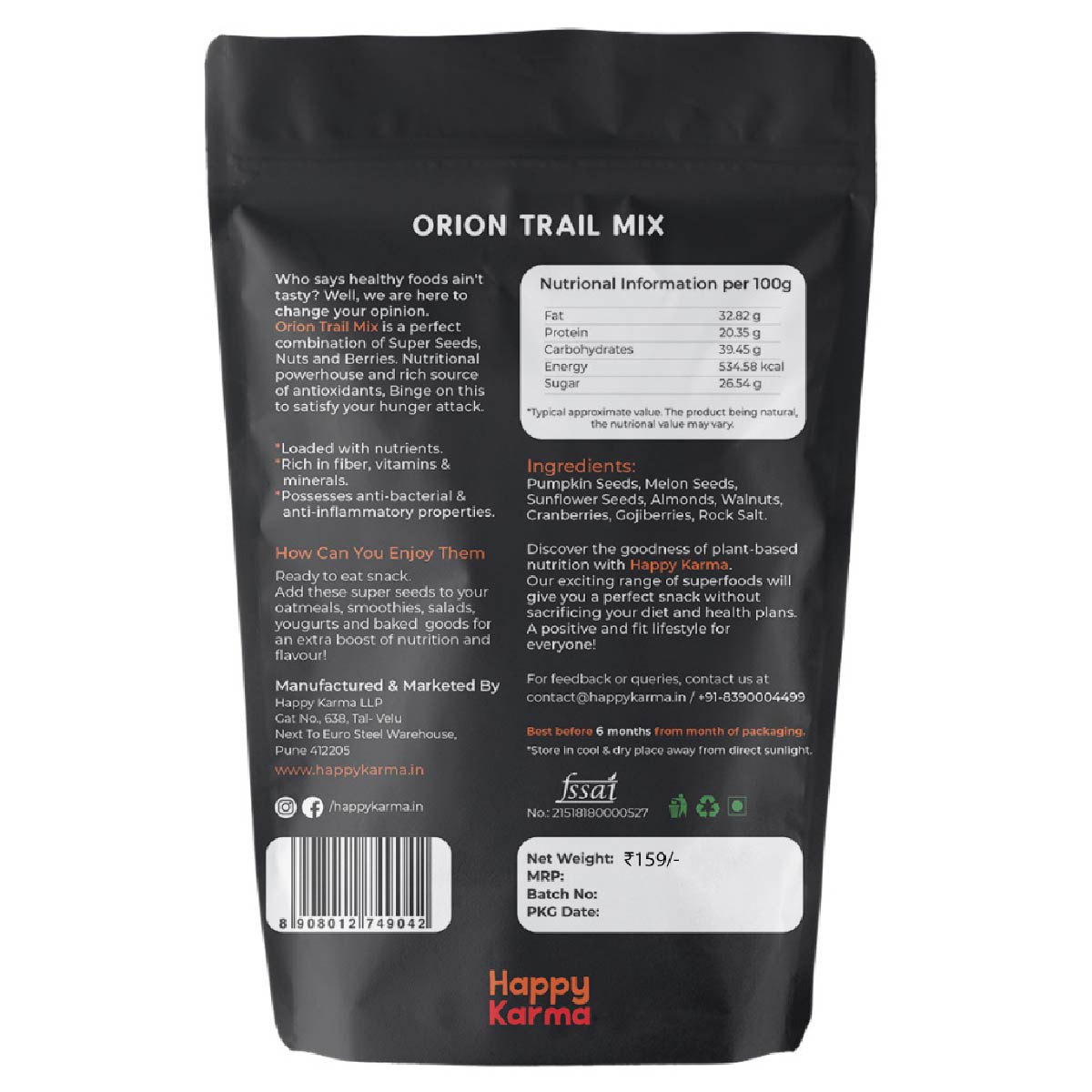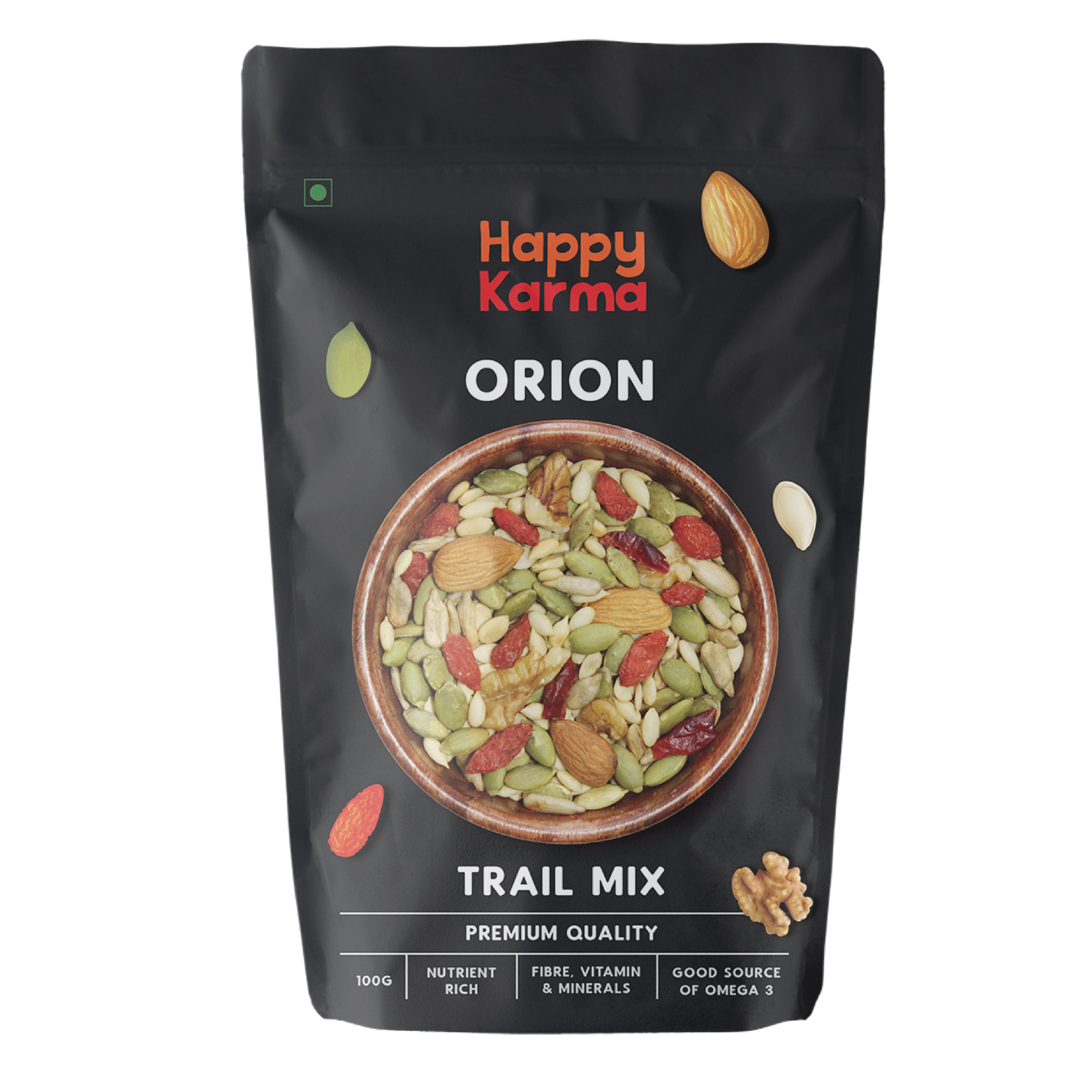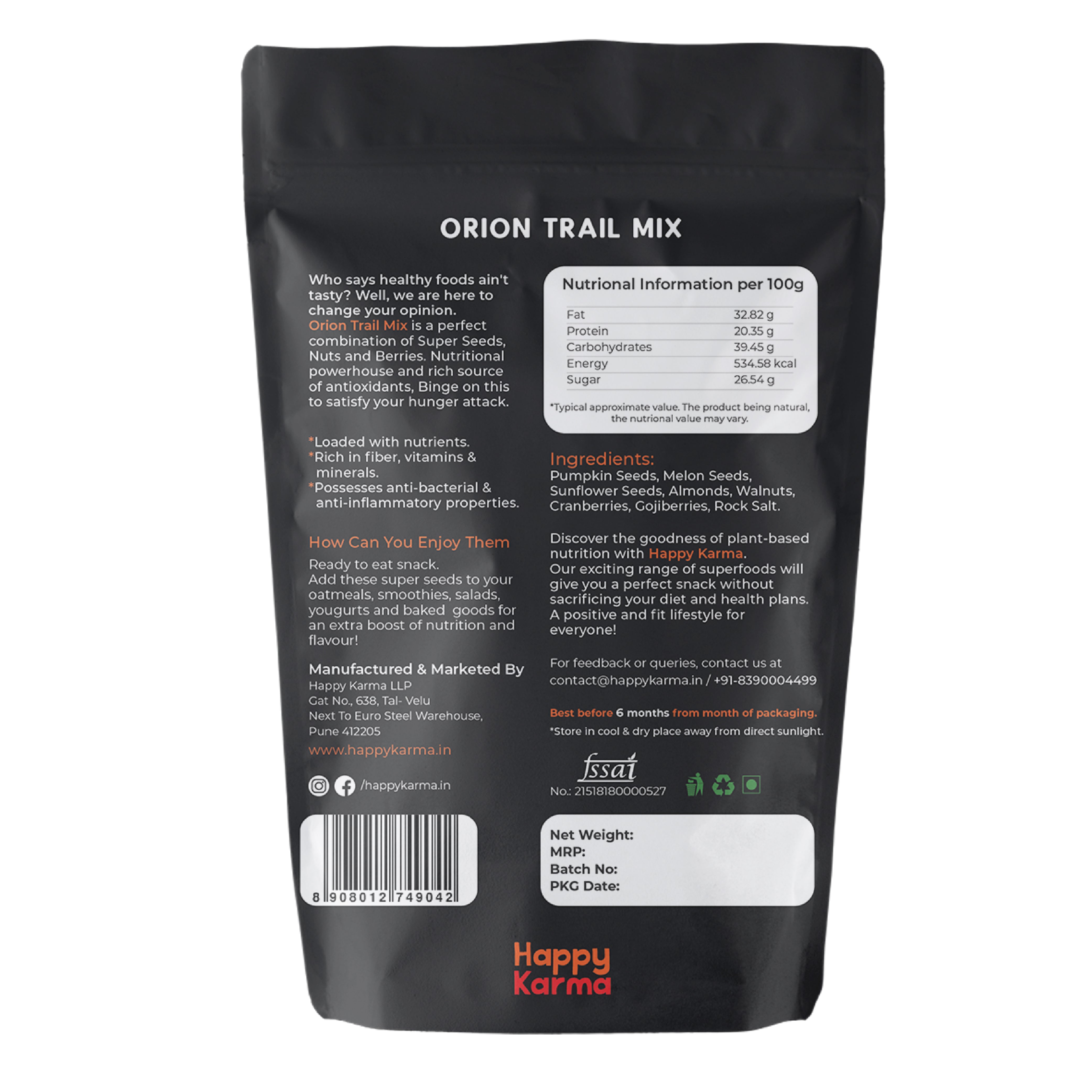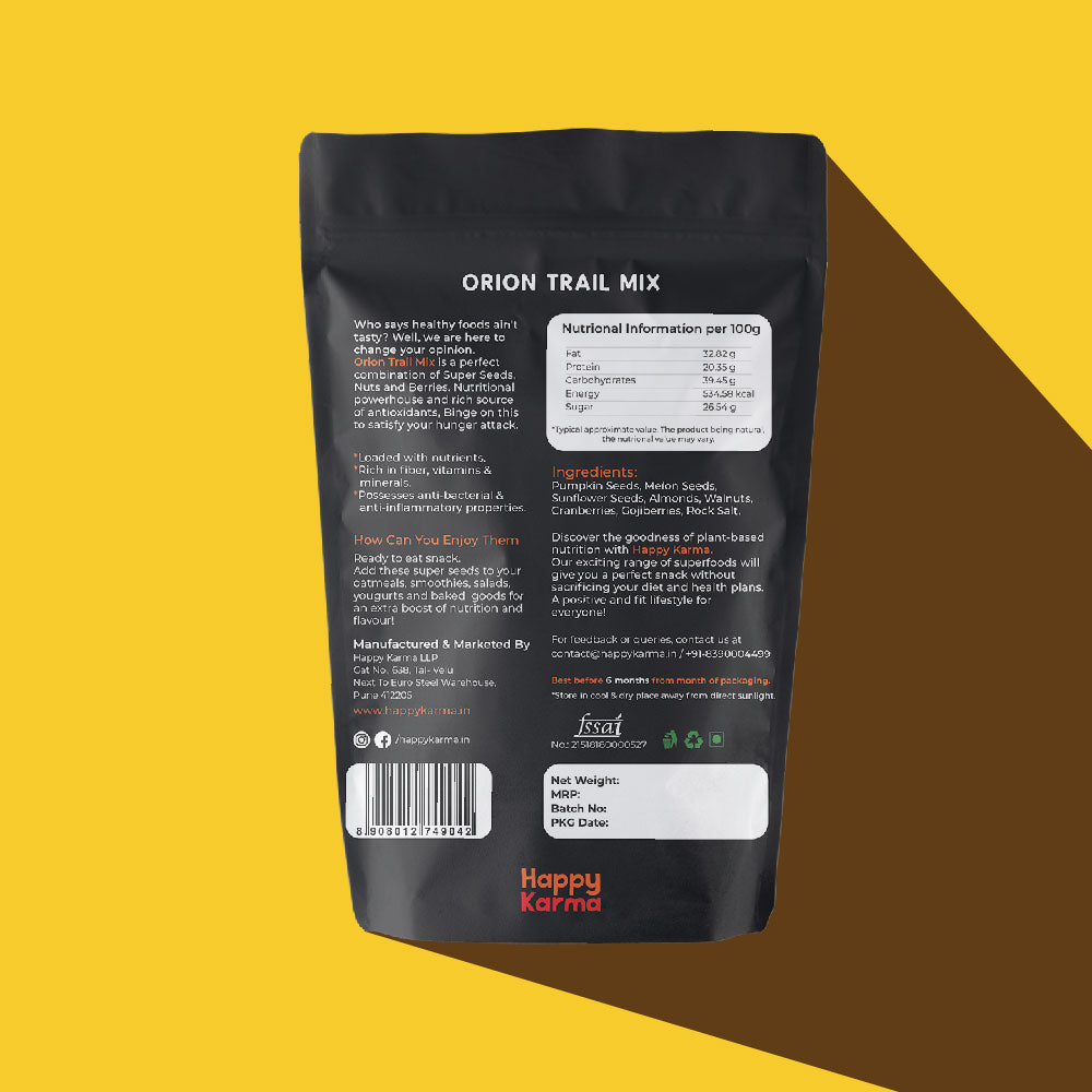Happy Karma Orion Trail Mix is a awestruking combination of all the superseeds which include Pumpkin seeds, Melon seeds, Sunflower Seeds, Almonds, Walnuts, Cranberries, Gojiberries, Rocksalt. It is a healthy snack alternative over the junk. The nutty and salty flavour makes it your new favourite snack.