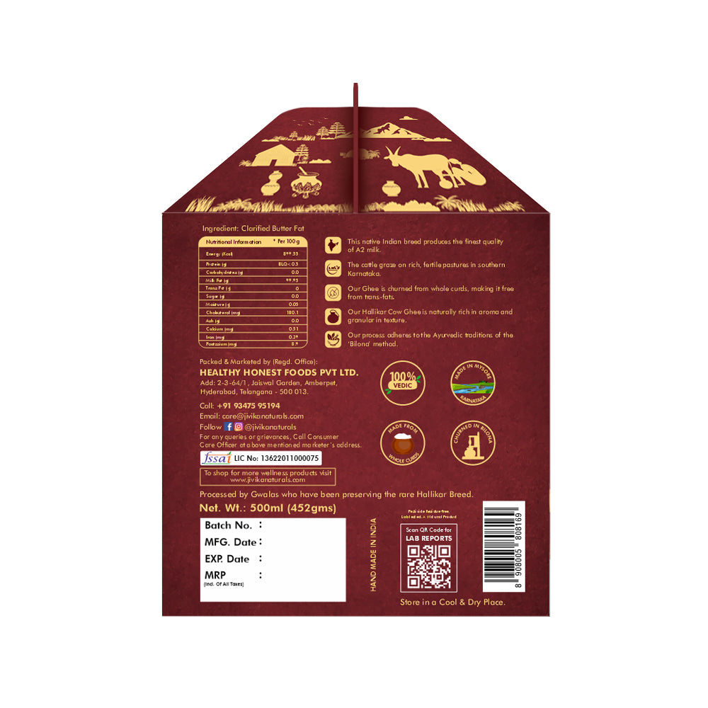 JIVIKA NATURALS® Premium A2 Hallikar Cow Ghee 500ml | Vedic Bilona Ghee from Karnataka | Hand Churned from Whole Curds | A2 Milk from Grass Fed Hallikar Cow | Pure and Authentic | (Glass Bottle 0.5 Litre)