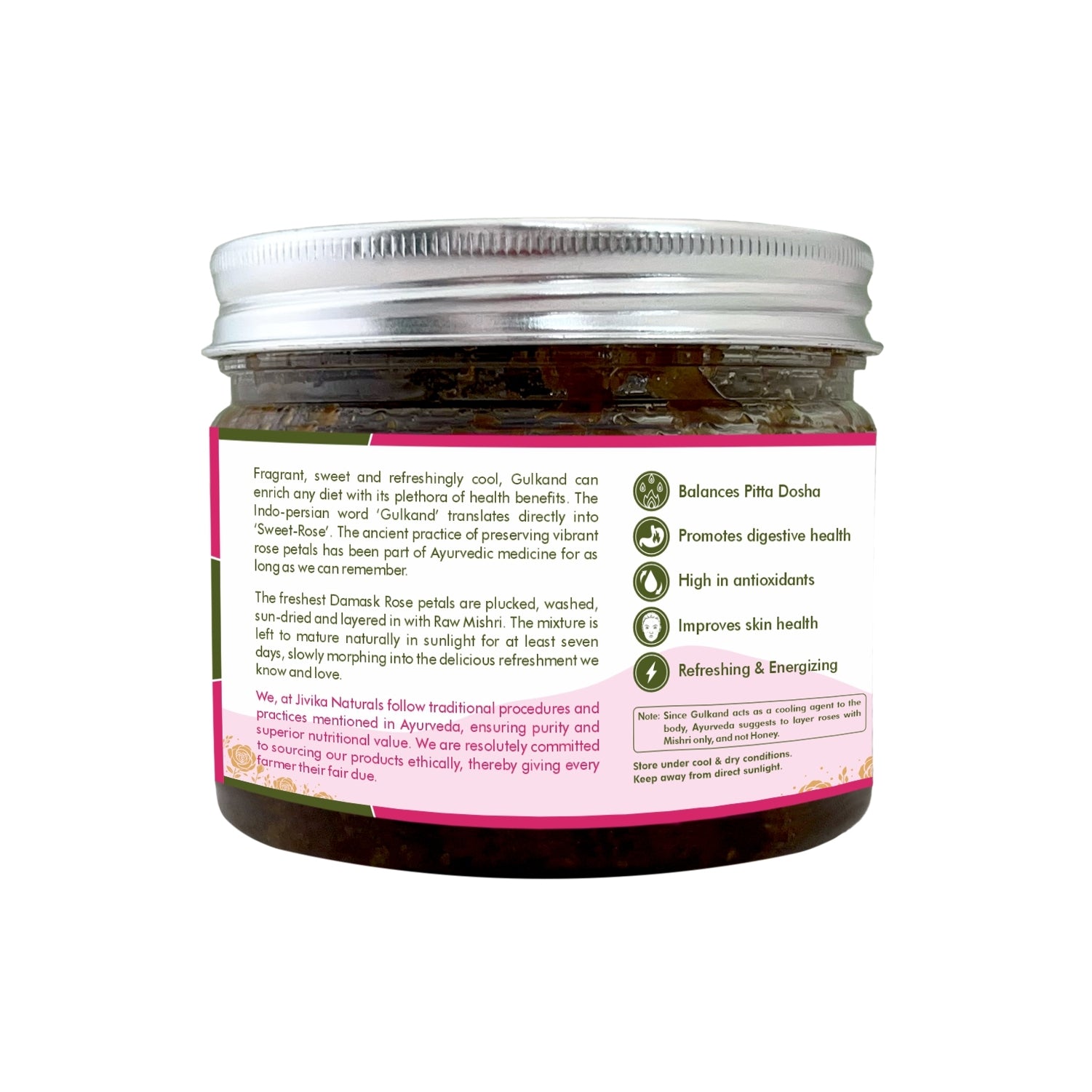 Nutritious Damask Rose Petals are carefully plucked and layered with Mishri. The mixture is then left to naturally mature in sunlight for 7 days.