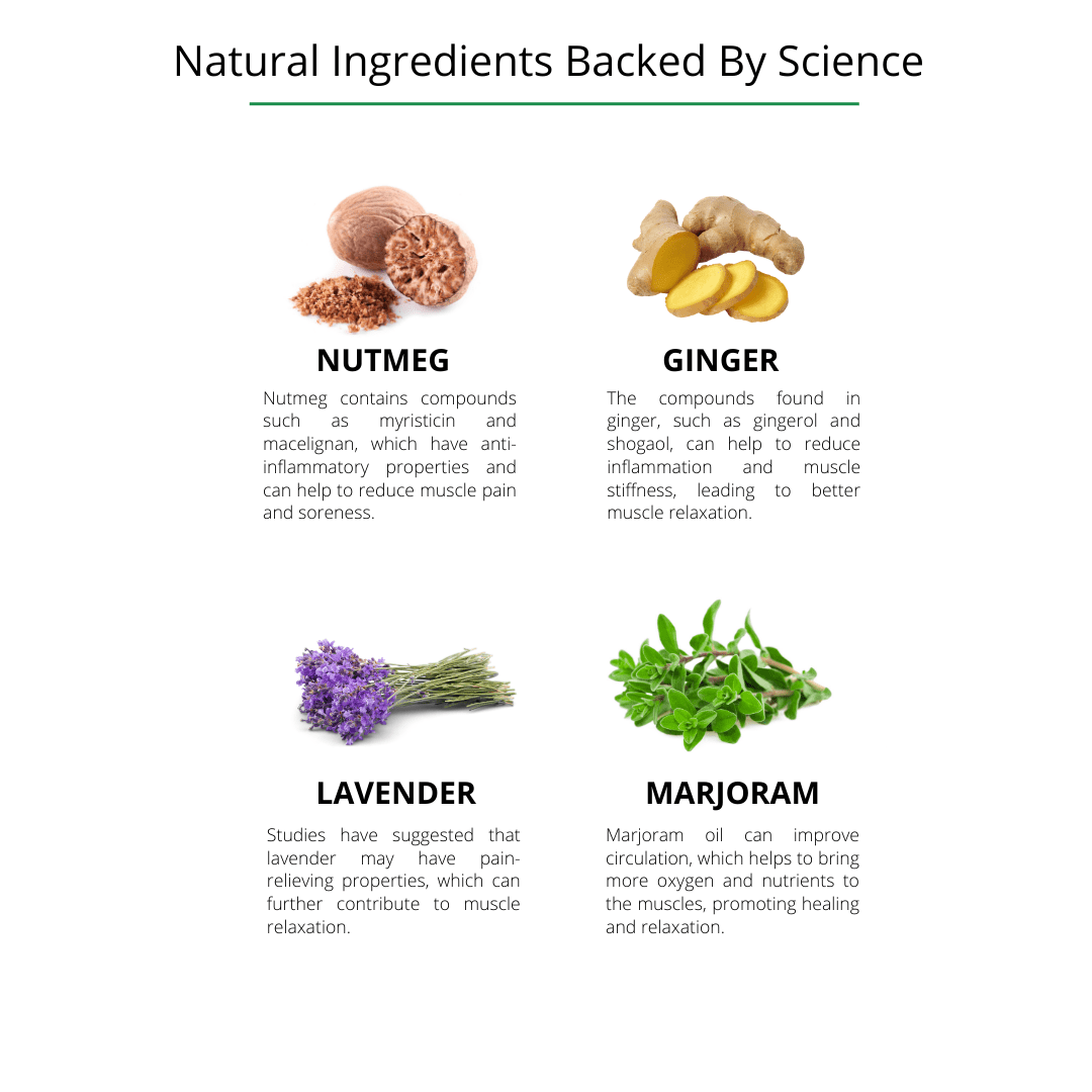 It contains oils of following herbs: nutmeg, lavender, ginger, marjoram