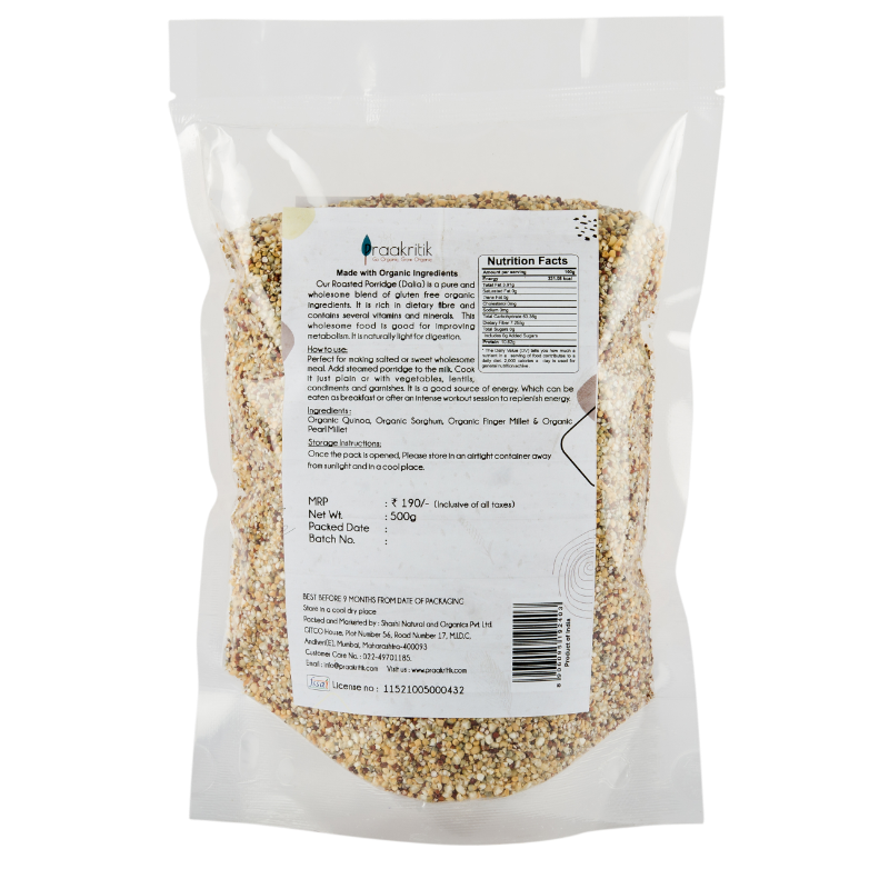 Our roasted porridge is a pure and wholesome blend of gluten-free organic ingredients. It is rich in dietary fibre and contains several minerals and vitamins. This wholesome food is good for improving metabolism. It is naturally light for digestion.