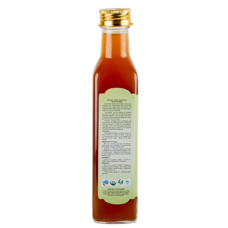 Our organic apple cider vinegar is raw, pure, unfiltered, and unpasteurized form of vinegar. It contains the purest form of vinegar called "The Mother". It is made from the fermented cider of the best organic apples from Himachal Pradesh. "The Mother" contains strands of proteins, enzymes, and friendly bacteria that may help to support the digestive system, immune system and condition of the hair. It may also aid in managing blood sugar levels and promote skin health. Cinnamon is enriched with a compound that mimics insulin and absorbs glucose. It effectively prevents glucose to enter the bloodstream. Fenugreek is one of the most popular ingredients that help stimulate insulin secretion in the pancreas and lowers the absorption of glucose.