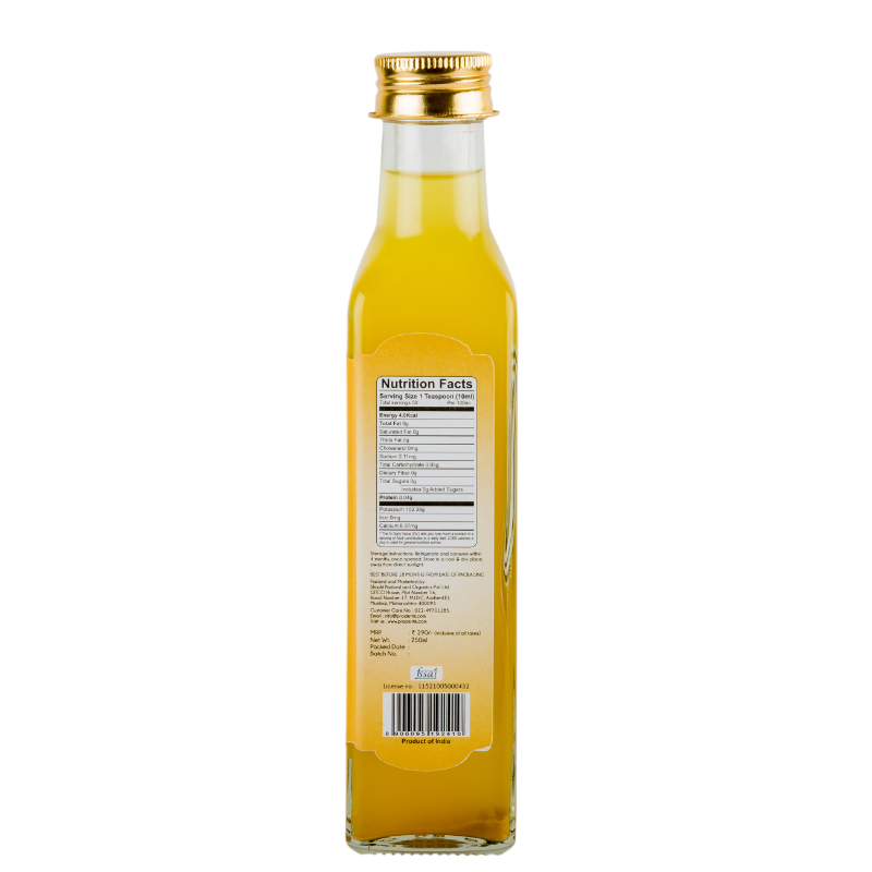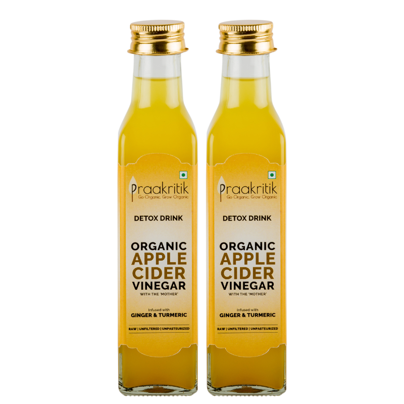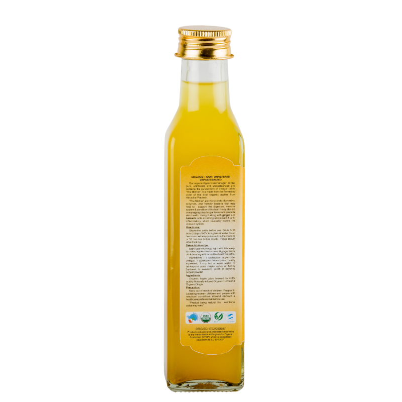 Our organic apple cider vinegar is raw, pure, unfiltered, and unpasteurized form of vinegar. It contains the purest form of vinegar called "The Mother". It is made from the fermented cider of the best organic apples from Himachal Pradesh. "The Mother" contains strands of proteins, enzymes, and friendly bacteria that may help to support the digestive system, immune system and condition of the hair. It may also aid in managing blood sugar levels and promote skin health. Combining it with ginger and turmeric increases the antioxidants and anti-inflammatory properties, which invariably boosts the immune system.