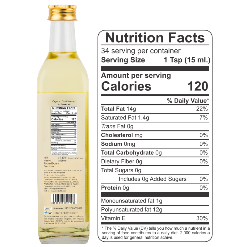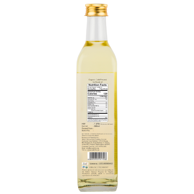 Our organic cold-pressed sunflower oil is devoid of any chemical processing and is extracted from organic sunflower seeds sourced from the finest organic farms across India. These perfect golden drops bring an ‘unbelievable lightness’ and a delicate flavor in all your meals. Our super-light cold-pressed sunflower oil is a reservoir of goodness. It is low in saturated fats and high in antioxidants, nutrients, Vitamin E, and polyunsaturated fats. This oil can withstand high temperatures and is easy to digest.
