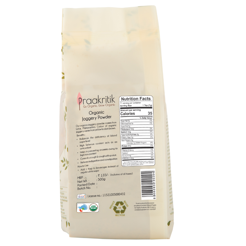 Mildly aromatic and distinctly sweet in flavor, this beautiful brown Organic Jaggery is a powerhouse of nutrients and minerals. A healthy replacement for sugar, this instant energiser is packed with antioxidants and selenium to keep you young and happy. Use it as a sweetener or just bite into it as a dessert to fulfill those sinful cravings. Our Organic Jaggery Powder is sourced from Organic sugarcane farms in Latur, Maharashtra. It is a natural cleanser and helps your body fight air-pollution. Ayurveda uses jaggery extensively because it purifies the blood, detoxes the liver, aids digestion, eases menstrual cramps, prevents anaemia, relieves joint pain and regulates blood pressure.This Organic Jaggery Powder helps boost your metabolism and hence aids weight loss too.