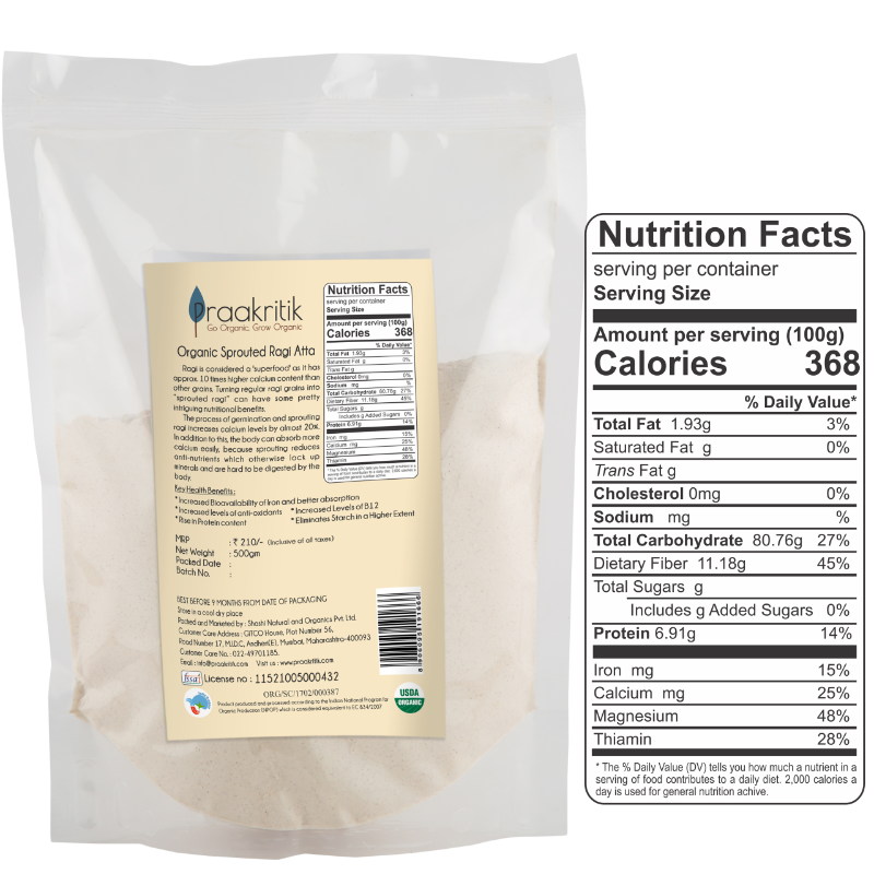 Ragi or Finger Millet is a popular ‘superfood’ with nearly 10 times higher calcium than other grains. Soaking ragi grains into sprouts helps increase its calcium levels and makes it easier for the body to absorb its goodness. Our Organic Sprouted Ragi Atta has increased bioavailability of antioxidants, iron, Vitamin B12, and protein. Its excess starch is eliminated due to the sprouting process. This high-fiber Organic Sprouted Ragi Atta is gluten-free and ideal for weight loss.