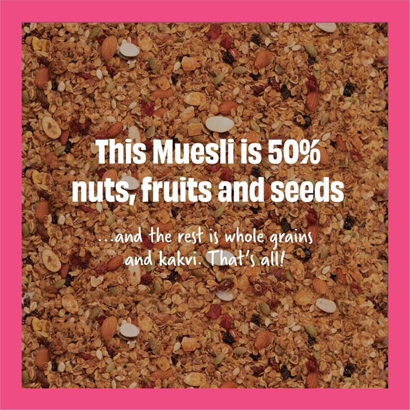 One half nuts, fruits & seeds. Other half whole grains & kakvi. This one’s wholesome….and then some!